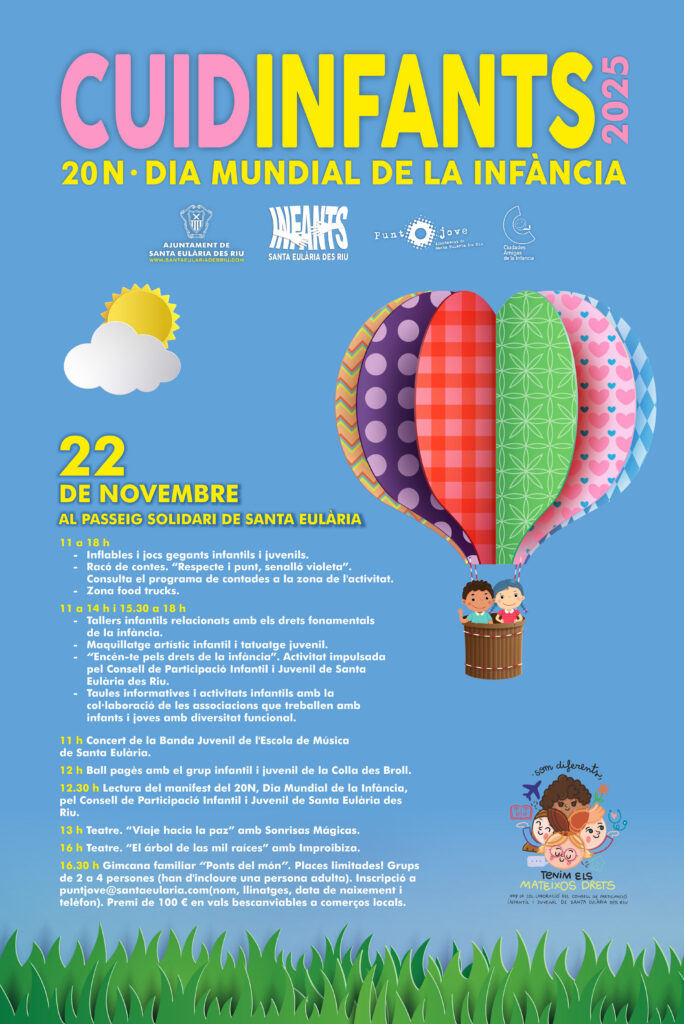Santa Eulària des Riu, 22 de novembre de 2025. Els infants de 3 a 11 anys tornaran a ser els protagonistes a Cuidinfants, la jornada organitzada pel Departament d’Infància i Joventut de l’Ajuntament de Santa Eulària amb motiu del Dia Mundial de la Infància. De 11 a 18 h, el Passeig Solidari es transformarà en un espai lúdic, educatiu i inclusiu, amb activitats pensades perquè els més petits juguin, aprenguin i facin sentir la seva veu.