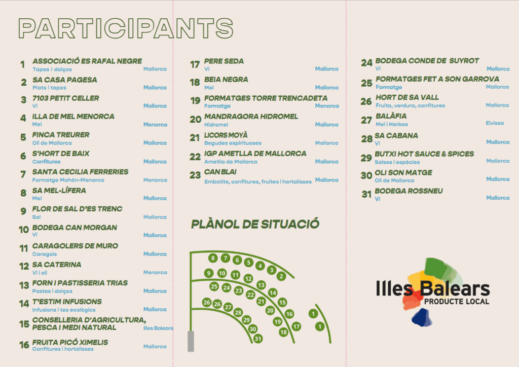 Entre els participants hi haurà cellers com Pere Seda, Bodegas Rossneu, Sa Cabana, Sa Catarina, 7103 Petit Celler, Bodega Can Morgan i Bodega Conde de Suyrot; productors d’oli com Finca Treurer, Oli Son Matge i Sa Caterina; formatgeries com Formatges Fet a Son Garrova, Formatges Torre Trencadeta i Santa Cecília Ferreries (Formatge Maó-Menorca), així com productors de mel com Sa Mel·lífera, Beia Negra, Balàfia i Illa de Mel Menorca.