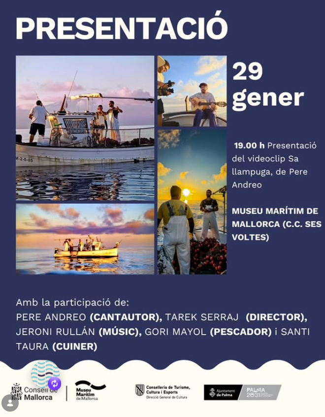 Palma, 29 de gener de 2026. El Museu Marítim de Mallorca, al C.C. Ses Voltes, acull aquest vespre la presentació de Sa llampuga, el nou videoclip del cantautor Pere Andreo, una obra audiovisual que connecta música, memòria i oficis tradicionals vinculats a la mar.
