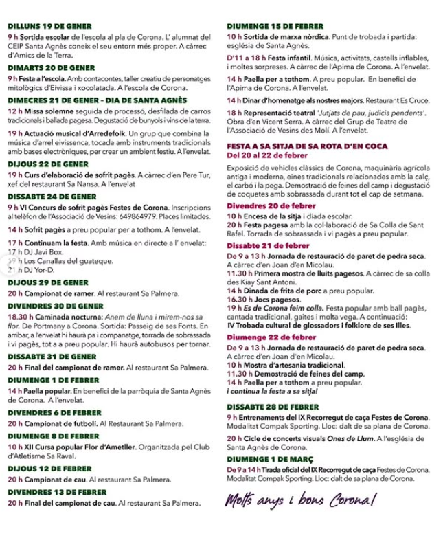 Santa Agnès de Corona, gener de 2026. El nucli de Santa Agnès de Corona ja ho té tot a punt per celebrar les seves festes patronals de 2026, una cita molt estimada al calendari d’hivern d’Eivissa que torna a convertir el poble en punt de trobada veïnal, cultural i festiu. Durant gairebé dos mesos, el programa inclou activitats pensades per a públic familiar, joves i majors, amb una clara aposta per les tradicions locals i la vida comunitària.